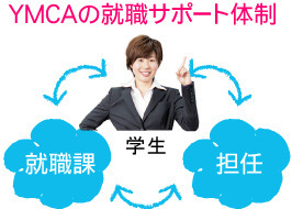 YMCAは、専門の就職スタッフとクラス担任とが連携して、学生一人ひとりの要望にきめ細かく対応。希望する職業探しから、就職試験対策、面接トレーニングまで段階的に、就職内定に向けたサポート体制を整えています。